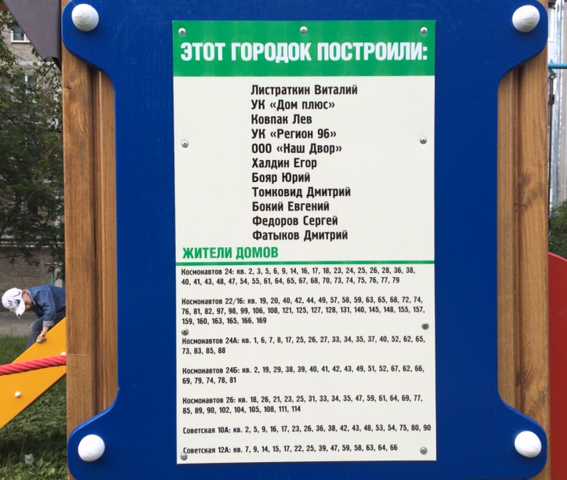 Поставили тринадцатый детский городок во дворе проспекта Космонавтов 24а, с февраля средства туда собирали. Инициатором выступил Евгений Бокий, очень результативно подключились жители соседних домов, управляющая компания "Дом плюс", УК "Регион 96", ощутимо помог Лев Ковпак, традиционный поклон в адрес фирмы-производителя игровых комплексов "Наш Двор".