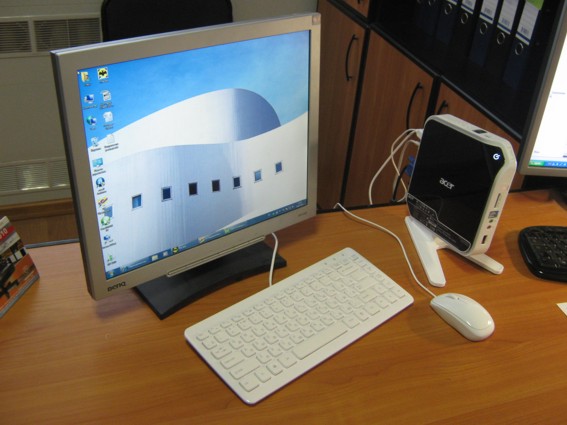 В общем, купил «Acer» в удобном настольном виде с интеловским чипом «Atom». Девайс офигительно удобен в силу именно своей настольности: места занимает чуть, под стол лазить чего-то включить не надо, «юэсбэ» разъемы торчат из всех щелей. Клавикорд и мышь – прилагаются. И всего-то – за десятку деревянных.
