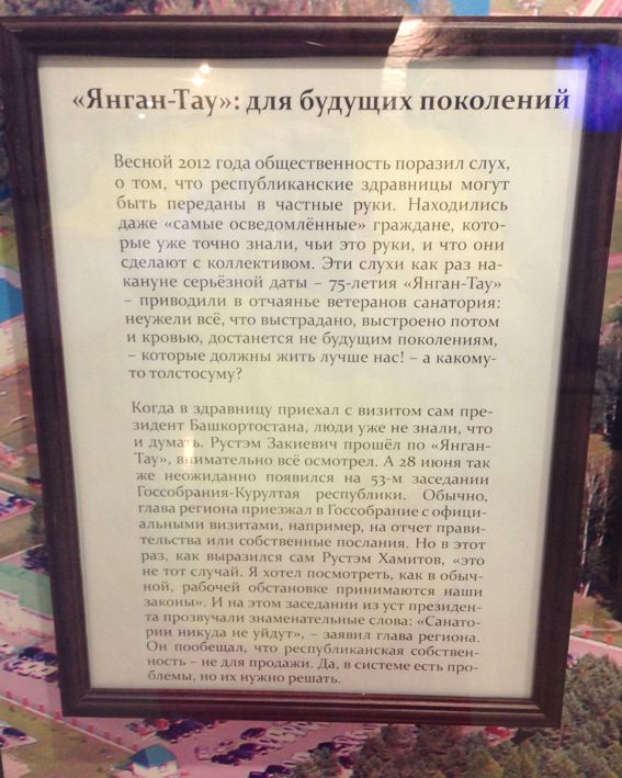 Санаторий – башкирское государственное унитарное предприятие. И вероятно, с приличной степенью доходности, поскольку на него в двенадцатом году был сделан накат с целью оттопырить столь ценную кубышку. Но руководство санатория доказало, что оно не лыком шито и организовало оборону аж через самого президента республики – атака была отбита. А в музее появилась вот такая победная реляция.