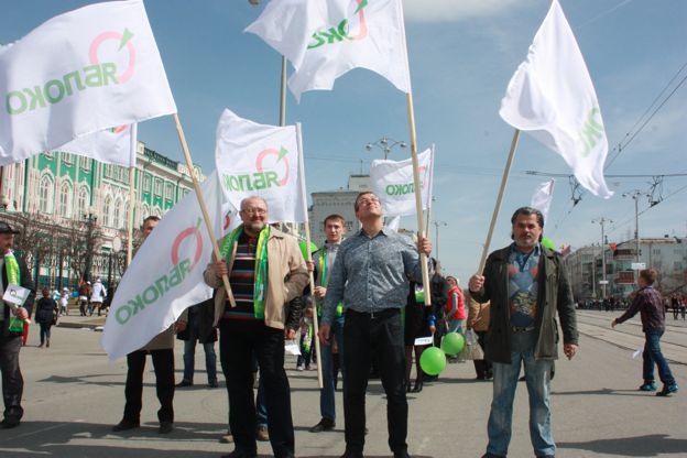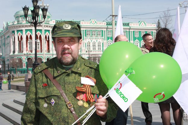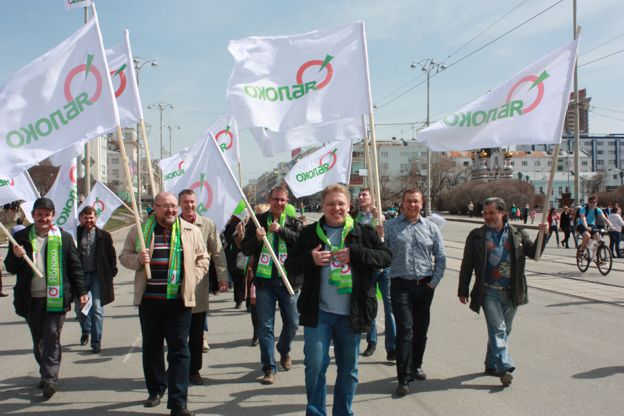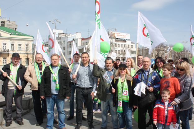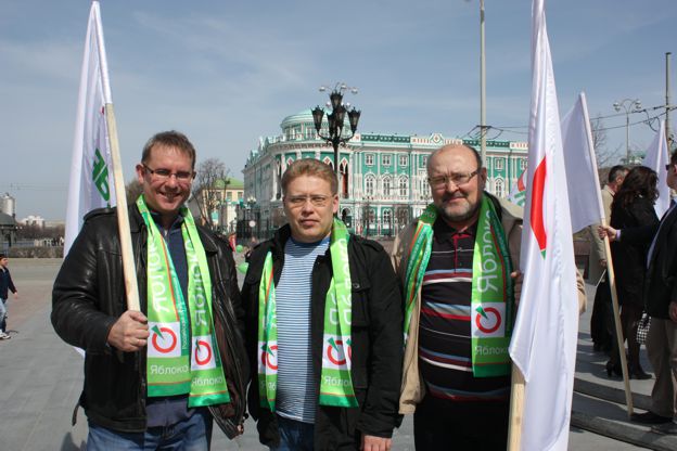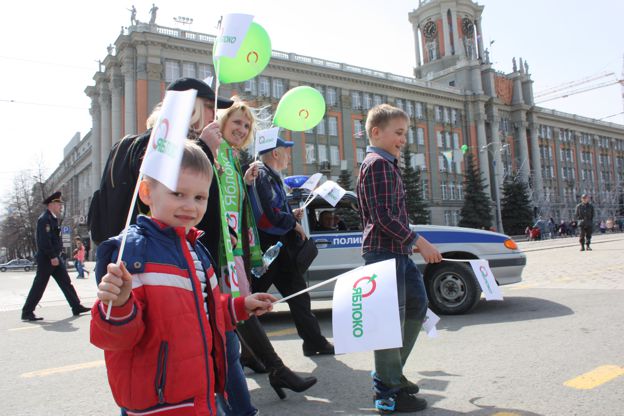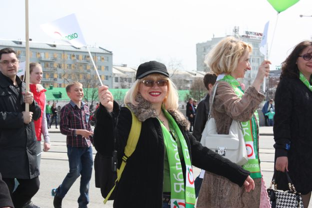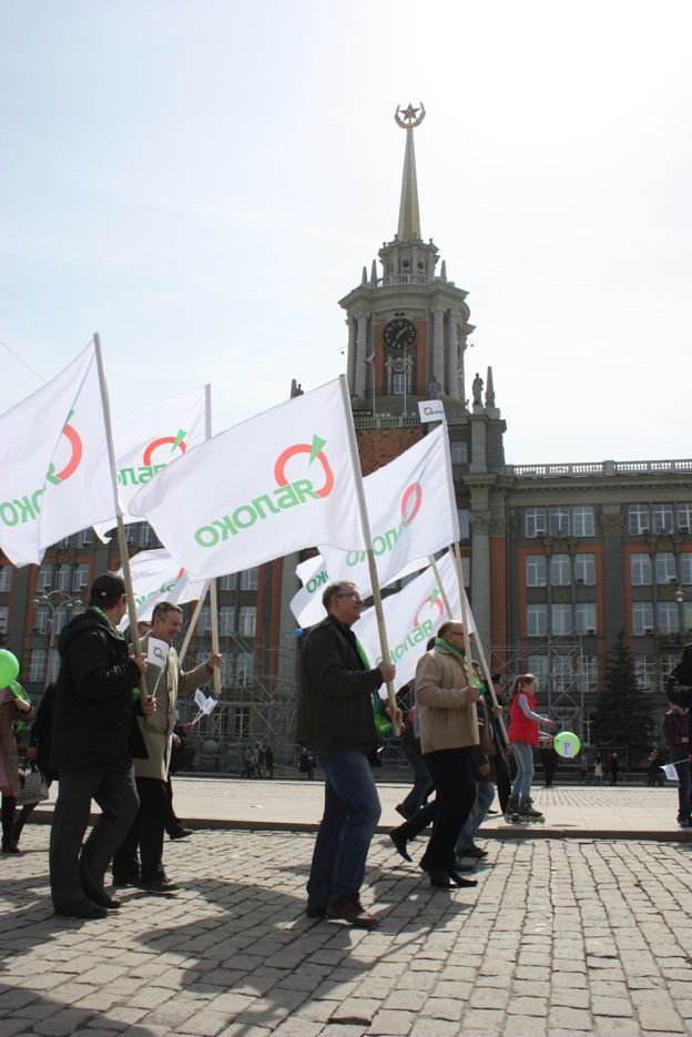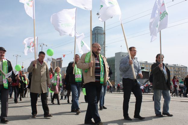 "Яблочная" колонна на первомайской демонстрации в Екатеринбурге