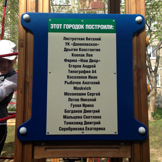 Мой низкий поклон ключевым участникам строительства: УК "Даниловское" и лично директору Болышеву Константину Викторовичу, фирме "Наш Двор" и лично директору Дмитрошкину Алексею Алексеевичу, депутату законодательного собрания Льву Игоревичу Ковпаку, первоуральскому депутату Дрыгину Константину Дмитриевичу. А также самым активным жителям этого двора: Сергею Мехоношину и Николаю Пелевину.
