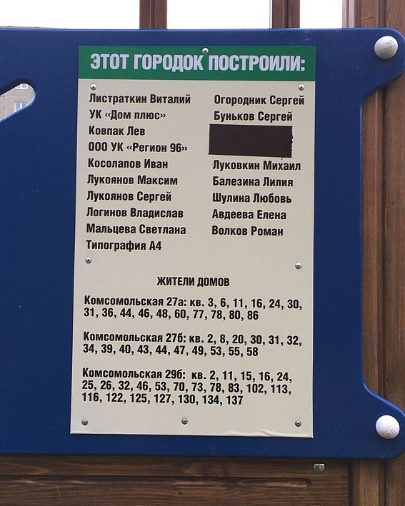Закончен девятый по счету детский городок от "Первоуральцев". Особо отмечу ключевых участников строительства: депутат заксобрания Лев Ковпак, УК "Регион 96", УК "Дом плюс", фирма-производитель игровых комплексов "Наш Двор". Жители двора чрезвычайно активно участвовали, как через прямые взносы, так и через оплату соответствующей строчки в квитанции, выставляемой УК "Дом плюс".