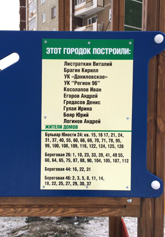 Поставили десятый по счету детский городок от "Первоуральцев". Ключевые участники: Кирилл Брагин, УК "Даниловское", УК "Регион 96", фирма-производитель игровых комплексов "Наш Двор". Вообще, жители дома Бульвар Юности 24 очень активные и неравнодушные. Думаю, летом там получится поставить качалку-балансир и песочницу.