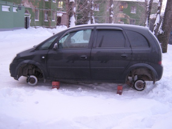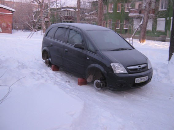 С которой кто-то ночью снял все четыре колеса и даже заботливо подставил кирпичи. Поражает энтузиазм "снимателей", ибо на улице температура совсем не шутейная: минус тридцать градусов.