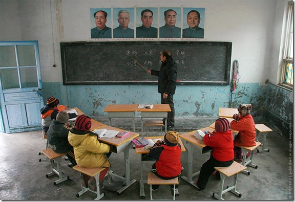 В школе на горе Сяохуань рядом с административным центром провинции Шаньдун городом Цзинань всего семь учеников и один учитель. Портреты на стене (слева направо): Мао Цзэдун, Лю Шаоци, Чжоу Эньлай, Чжу Дэ и Дэн Сяопин.