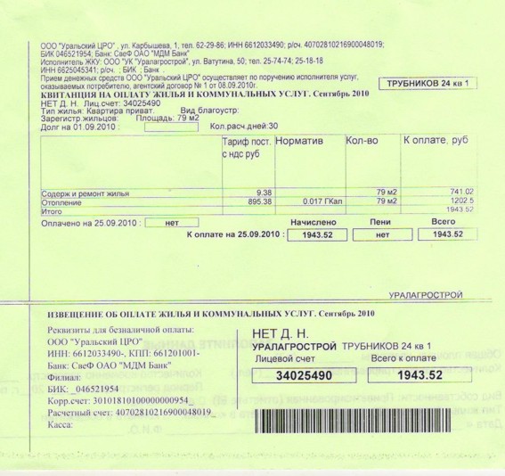 С легким изумлением изучил свежеполученную квитанцию из ООО «Уральский ЦРО», изданную на бумаге легкомысленного салатового цвета. И написаны там поистине чудные вещи. Для меня, например, стало открытием, что в офисе «Интерры» нагло проживает некто Дмитрий Николаевич Нет. И судя по всему, жизнь у чувака бьёт ключом: за сентябрь у него натопили тепла аж на тыщщу двести, а наремонтировали чего-то на целый семьсот один рубль, и что характерно – две копейки.