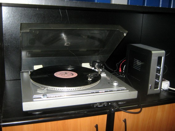 Естественно, встал вопрос, на чем все это богатство слушать. На мое счастье, у отца всё еще сохранился проигрыватель "Вега-110" - просто стоял, пылился где-то под кроватью. Девайс слегка поскрипывает на ходу, но в принципе работает. Я его как следует почистил и зверушка после двадцатилетнего простоя ожила. Пришлось, правда, помудрить в процессе присобачивания "Веги" к современному усилителю. В итоге получился вот такой симбиоз: