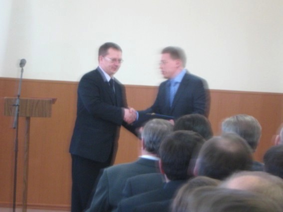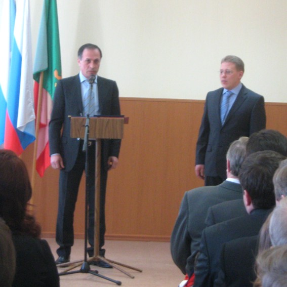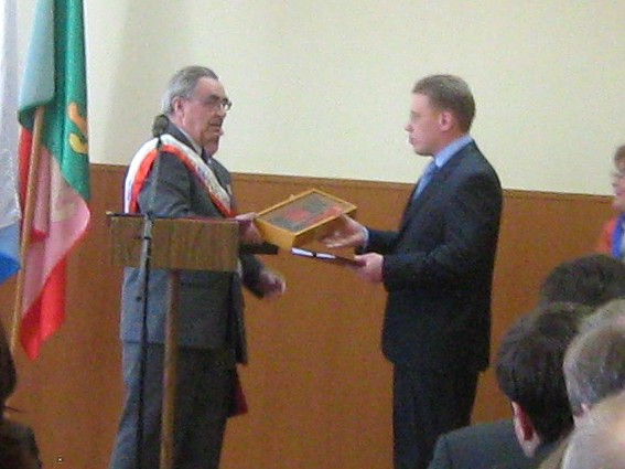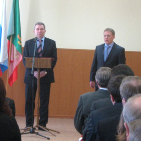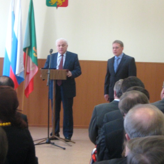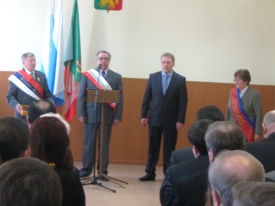 Сначала мэра поздравил председатель избиркома, он же вручил соответствующее удостоверение.