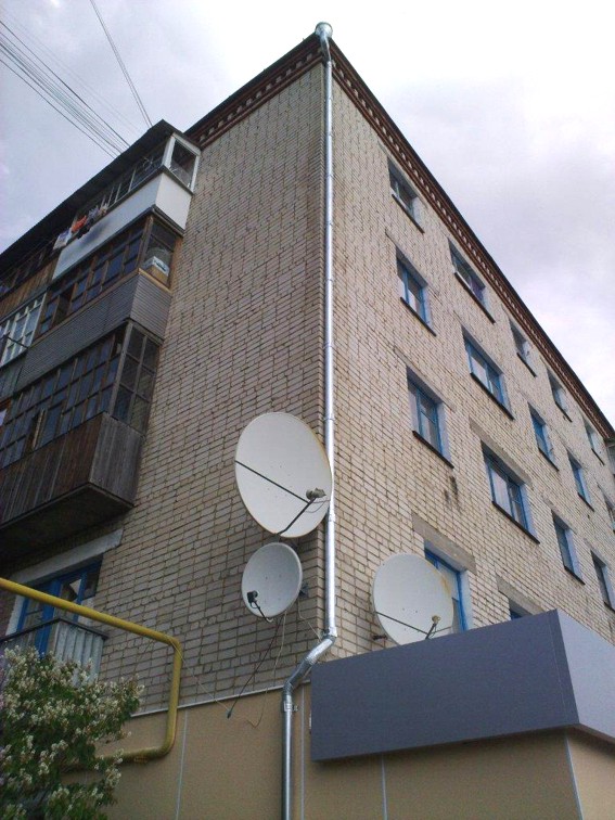 Обратите внимание - новехонькая водосточная труба. Спутниковые тарелки - соседские.