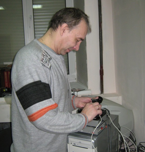А это директор филиала – Рудольф Кожевников. Смотрит что-то. Кажется, скалыватель к сварочнику оптики. А может, просто хитро улыбается)