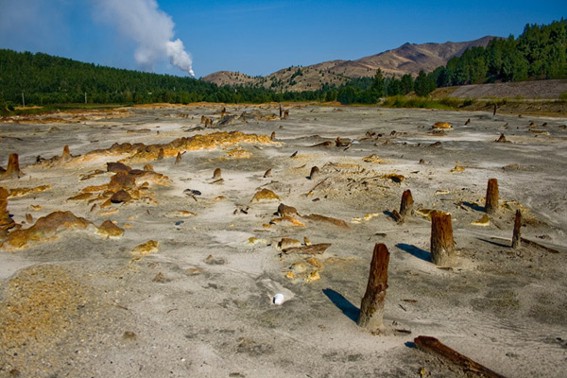 Зимой окрестности выглядят довольно безобидно, но снег на склонах при ближайшем рассмотрении оказывается жёлтым.