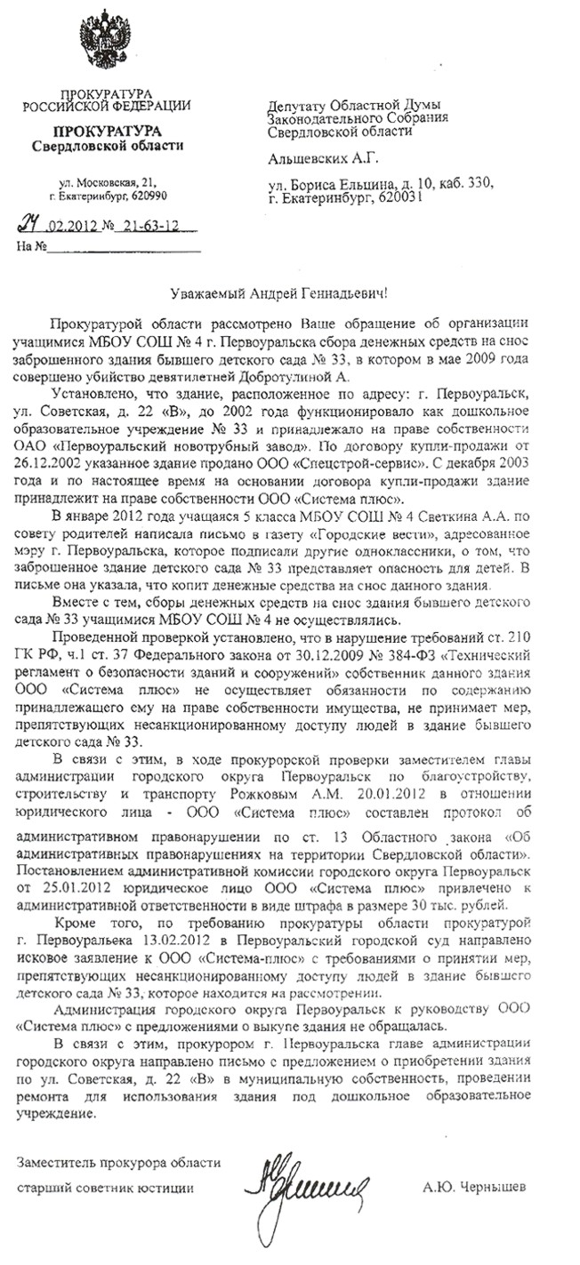 Итак, подъехал первый разрыв по мине, которую мы заложили в январе вместе с депутатом облдумы Андреем Альшевских по теме «заброшенных садиков». Вообще, метод депутатских запросов – достаточно простой, но эффективный. И почему его не использовал местный депутат Марат Сафиуллин – ума не приложу, хотя (как он сам признает) все два срока по данному вопросу его троллил электорат с улицы Емлина. Но Марат то ли не догадался написать запрос, то ли какие-то более важные дела его отвлекли – как знать. Слава Богу, Андрей нашел время, несмотря на то, что Первоуральск – в общем-то, не его округ.