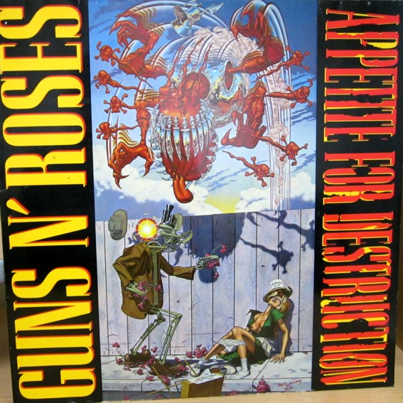 Далее: самый первый диск американской группы Guns N’ Roses - «Appetite For Destruction» («Склонность к разрушению») 1987 года. Первоначально на обложке альбома был помещён рисунок Роберта Уильямса, изображавший монстра с кинжалами вместо зубов, нападающего на робота, склонившегося над бесчувственной женщиной в разорванном платье и со спущенными трусами. У меня именно такой диск.