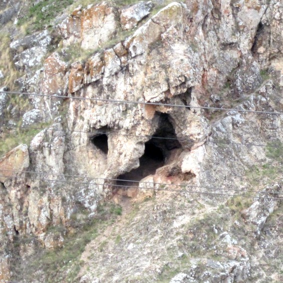 При ближайшем рассмотрении "пещеры" оказываются тремя углублениями в известняке - очень похоже на великанские ноздри.