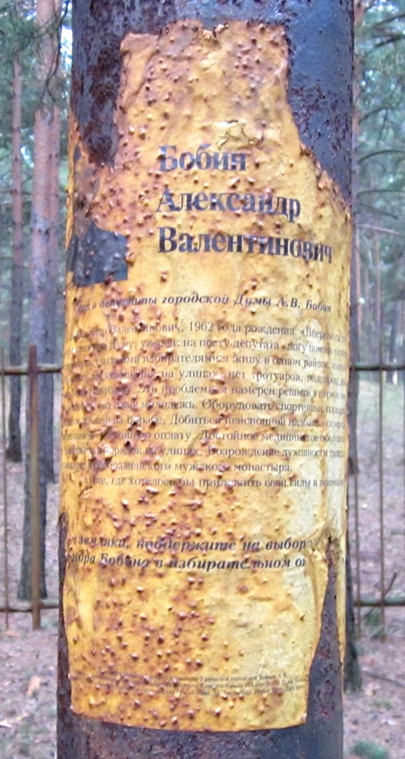 В лесу может неожиданно попасться вросшая в столб предвыборная листовка. Где ты сейчас, кандидат в депутаты Бобин? Избрался ли ты, возродил ли духовность каменской молодежи? Поддержали тебя земляки?