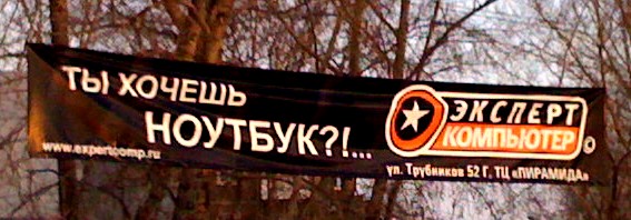 Другой пример – растяжки компьютерных магазинов «Эксперт». Ума не приложу, какой идиот их разрабатывал. Вот скажите, как должен реагировать потенциальный покупатель на вопрос «Ты хочешь ноутбук?!» Какой он должен получить посыл? Истекать слюной что ли? А сочетание вопросительного и восклицательного знаков? Это что, такое удивление вдруг возникшему желанию поиметь ноутбук или такой тонкий намек на врожденную дебильность потребителей: «Как? Не может быть! Вы действительно знаете, что такое ноутбук, чтобы хотеть его? Да вы извращенец!»