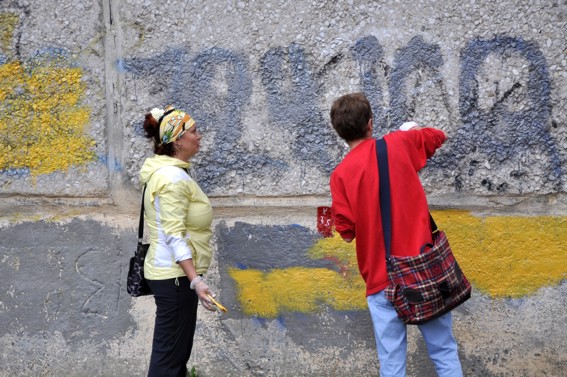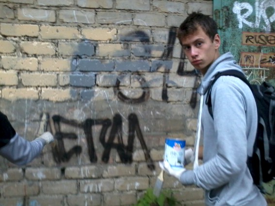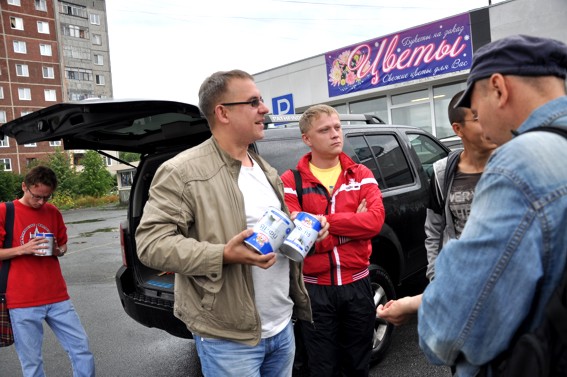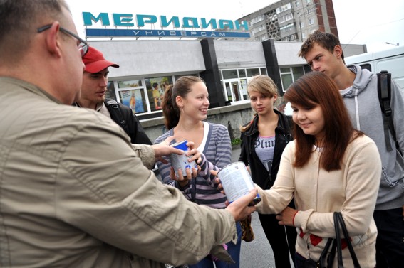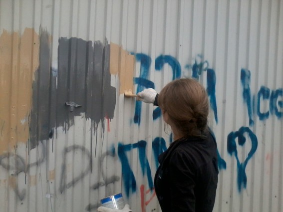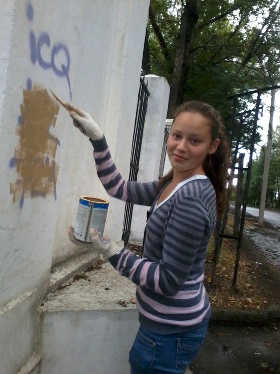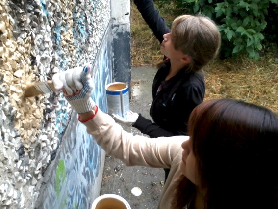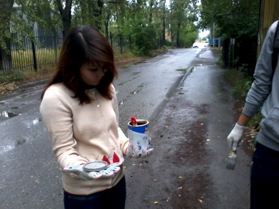Раздача банок с краской и кисточек. Фотографирует, кстати, Настя Пономарева с "Городских Вестей".