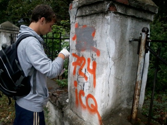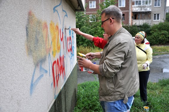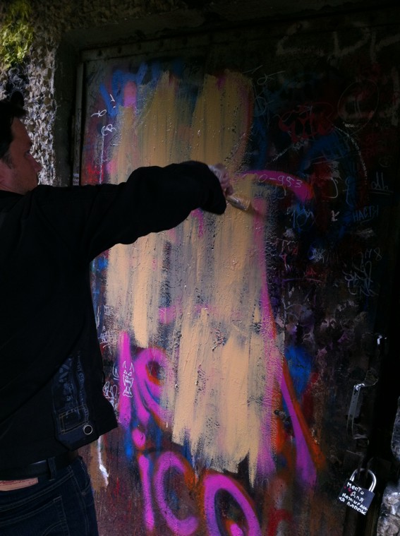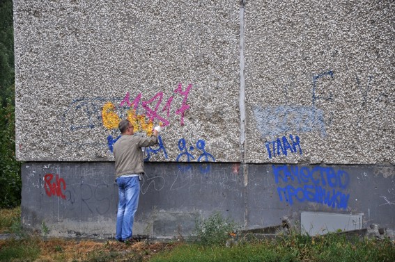 Максим Копыркин закрашивает диковинно разрисованную дверь (обратите внимание на замок).