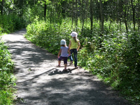 Детки обошли шлагбаум и дружно пошагали по пешеходному маршруту к реке.
