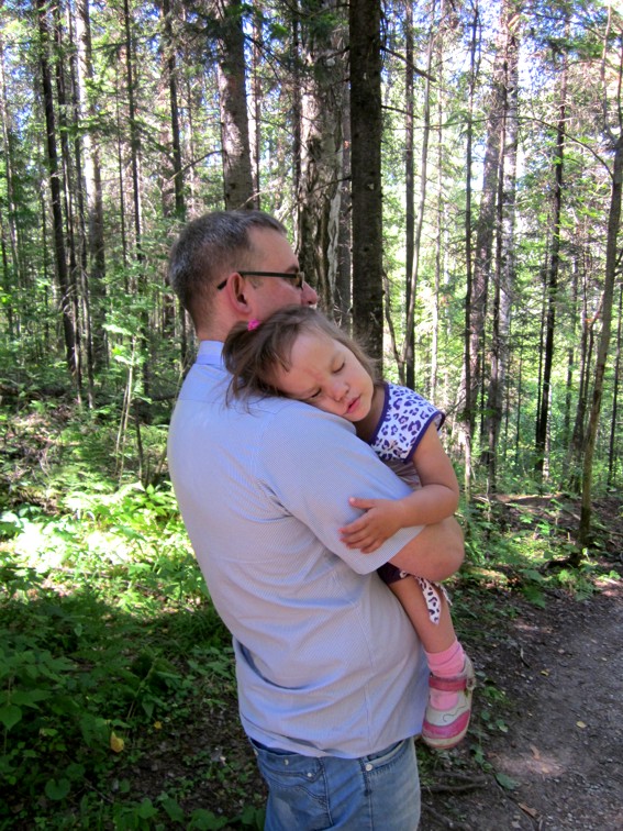 По маршруту мы шли три с половиной часа. Старшая дочка прошагала всё путешествие, а младшая устала и попросилась "на ручки", где и заснула)