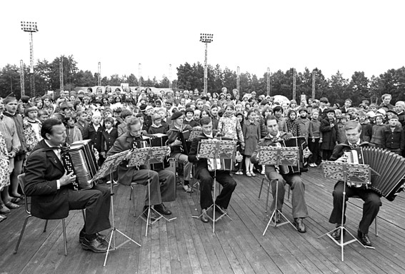 В архивах первоуральского фотографа Николая Булыгина нашлось фото 1980 года с празднования дня города - квинтет баянистов, выступает, как я понимаю, на тогдашнем стадионе.